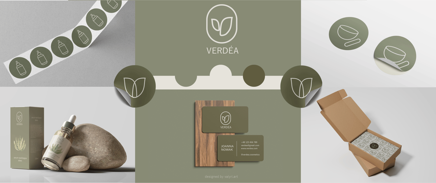 Projekt identyfikacji wizualnej dla marki kosmetycznej opartej na naturze. Stonowana paleta zieleni, organiczne kształty i subtelna typografia podkreślają filozofię marki - troskę o skórę i środowisko.