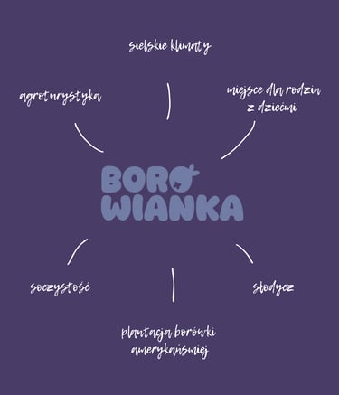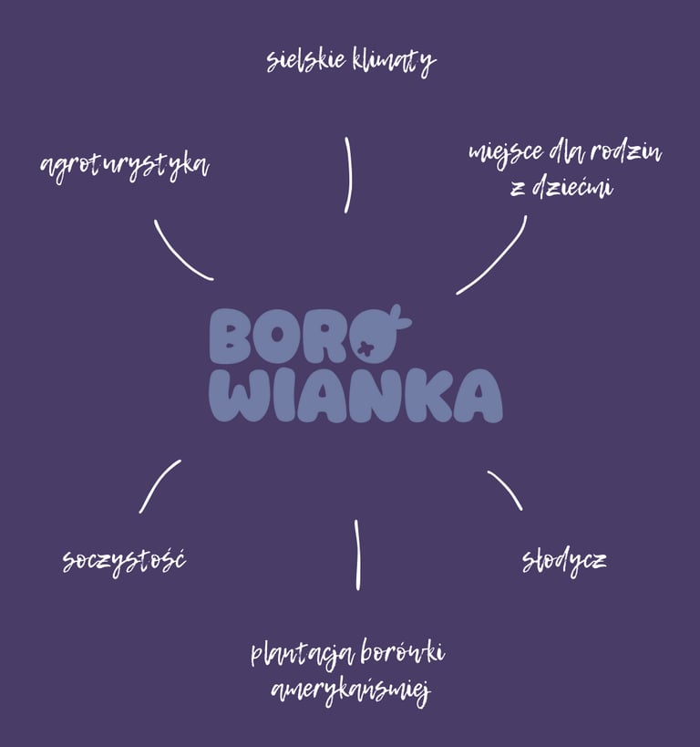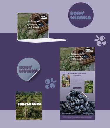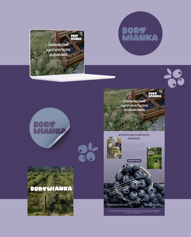 Branding koncepcyjny dla agroturystyki otoczonej plantacją borówek, w której natura i spokój stają się częścią codzienności. Kolor przewodni to fiolet, który bezpośrednio nawiązuje do owocu oraz podkreśla naturalny charakter miejsca.