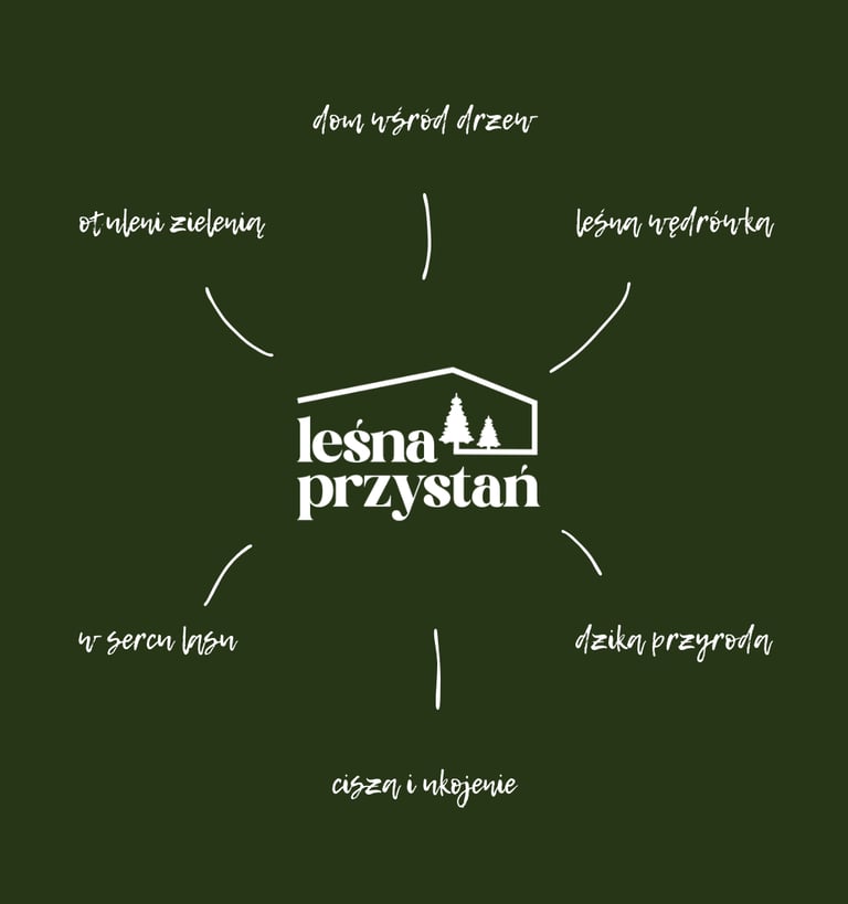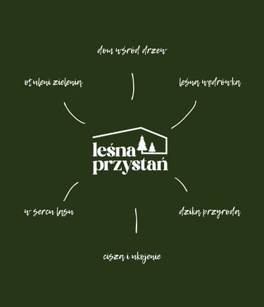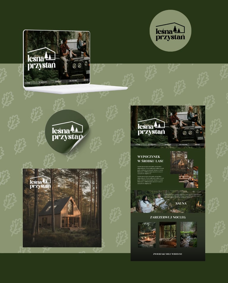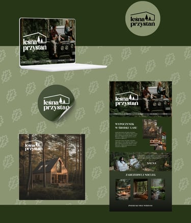 Branding koncepcyjny dla Leśnej Przystani, miejsca ukrytego wśród drzew, gdzie zapach lasu tworzy przestrzeń do prawdziwego odpoczynku. Całość oparta na idei powrotu do natury. Projekt, który pozwala poczuć zapach mchu i ciepła porannego słońca przebijającego się przez korony drzew.