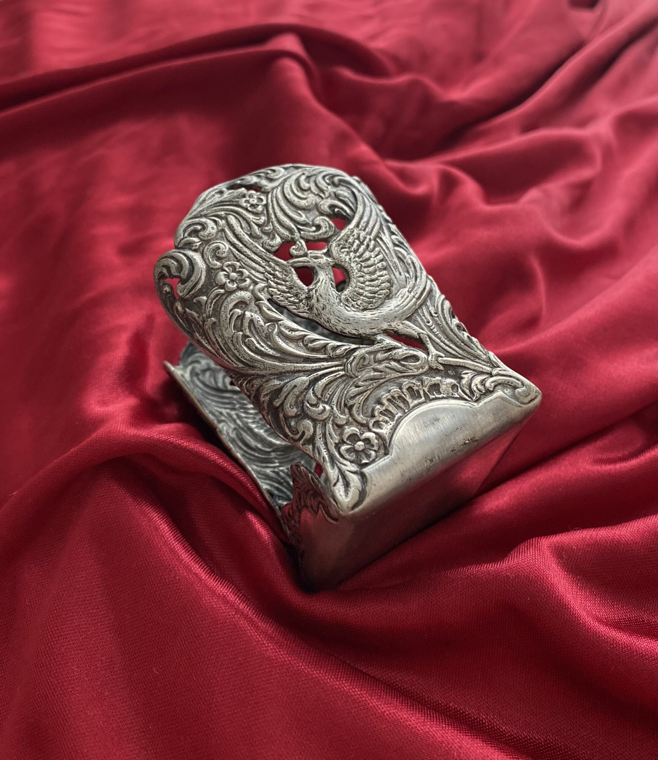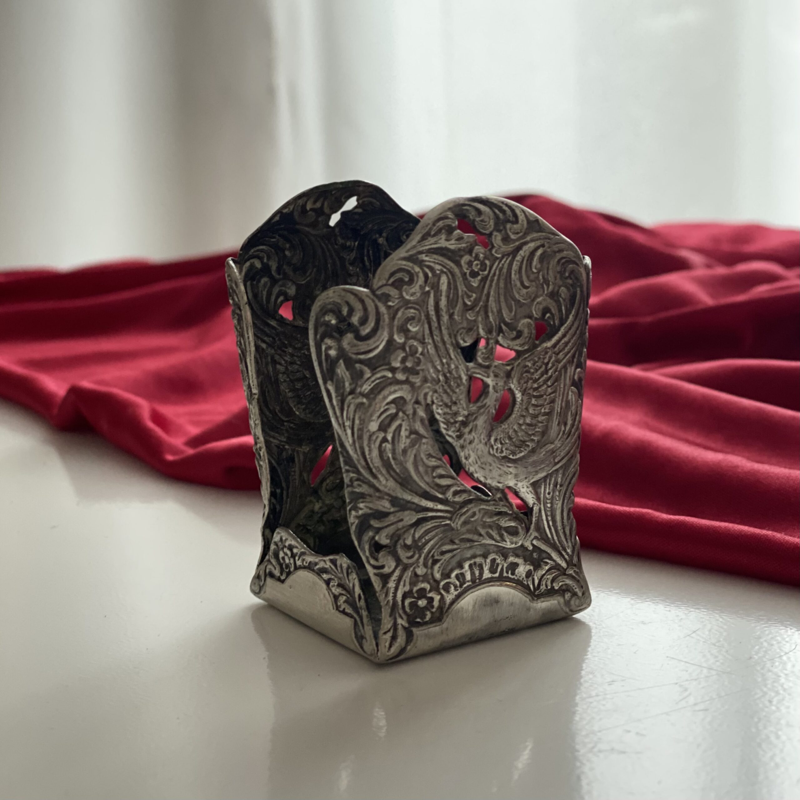 Posrebrzany serwetnik z motywem ptaka, który wprowadza elegancję na stół. Perfekcyjnie łączy funkcjonalność z ponadczasowym stylem.